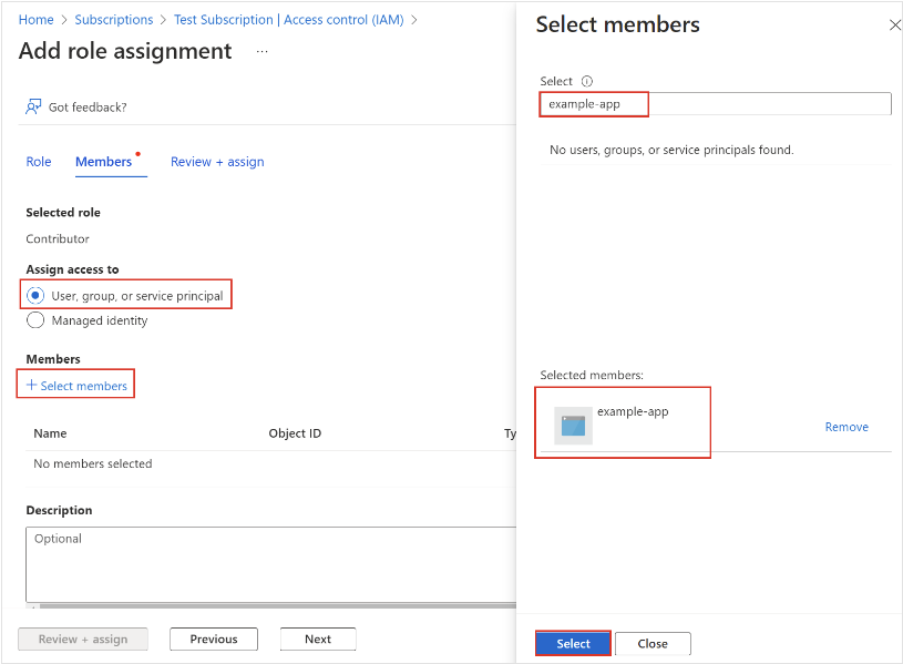 7. On the **Members** tab, for **Assign access to**, select **User, group, or service principal**.