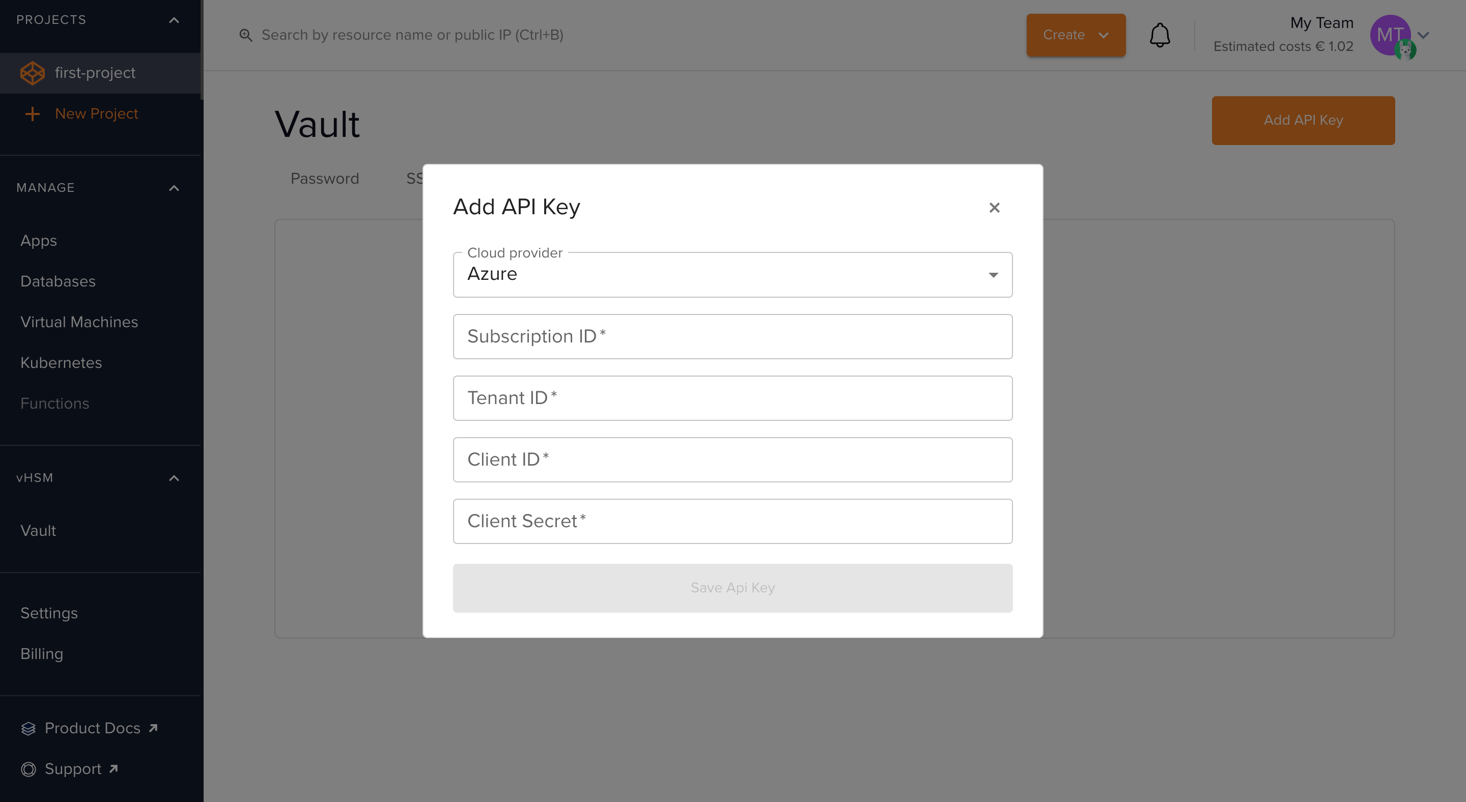 in the EMCP, go to **vHSM** -> Vault -> Cloud Keys to add the API key. Once you finish everything, fill in the details of all the IDs and secrets you saw above.